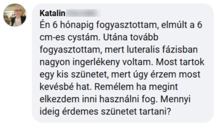 Én 6 hónapig fogyasztottam, elmúlt a 6 cm-es cystám. Utána tovább fogyasztottam, mert luteralis fázisban nagyon ingerlékeny voltam. Most tartok egy kis szünetet, mert úgy érzem most kevésbé hat. Remélem ha megint elkezdem inni használni fog. Mennyi ideig érdemes szünetet tartani?